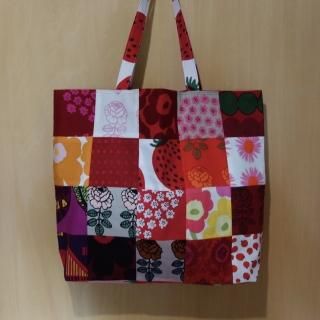 marimekko パッチワーク ハンドメイドのマチ付き肩掛けバッグ(赤系)