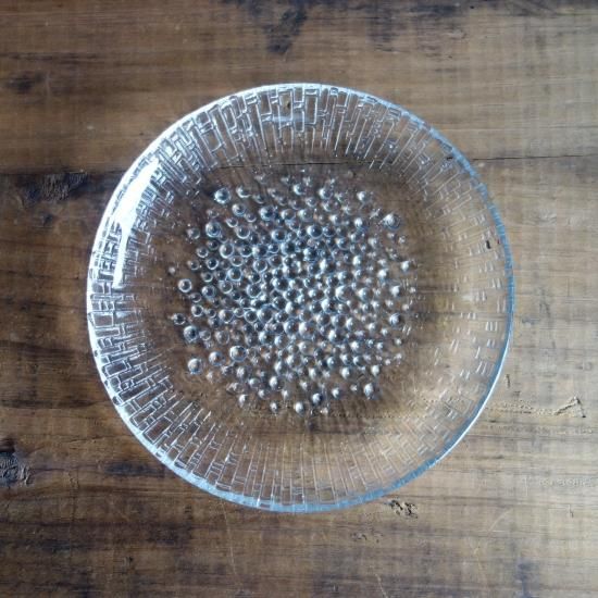 プレートのサイズは直径15 cm × 高さ1.8 cm ほどになりますが、手作業の証とも言える絶妙な歪さが生じている特徴があります。また、ガラス加工時の細かな水泡、ゆらぎ、細かなキズなどは出ている可能性はございます。