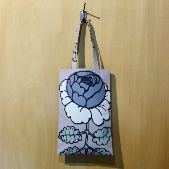 素材はコットン 100%で、ほんのりとツルッとした優しい肌触りのするサテンの様な生地感をしています。大きさはタテ32 cm × ヨコ20.5 cm × 持ち手長さ41 cm(幅2 cm)ほどになります。