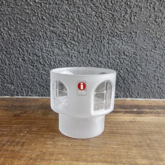 側面に象られた4つの窓がとても可愛らしいキャンドルホルダーと言えます。くもりガラスとクリアガラスを組み合わせることで立体感と奥行きを感じさせてくれます。窓は表面から見るとやや内側へくぼんでおり、くもりガラスの部分は氷砂糖の表面の様なザラザラ感はありますが、クリアガラスの部分は滑らかです。真っ赤な金属製のフレームとの接触部のくもりムラは少々感じられるものの、擦れやくすみ汚れなどは殆ど見られず、目立つ擦れ、キズ、汚れなど見られないことから、概ね綺麗な状態と言えます。iittala ロゴシールは殆ど綺麗な状態で残っております。