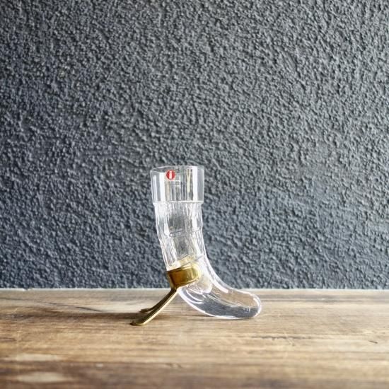 iittala社の一風変わったガラス製のタンブラーで、ロゴシールから判断すると1970年代前半頃に作られた vintage となります。人という漢字、殿様バッタ、海老反り、腕立て伏せ、プロポーズしている時のポーズの様な反りのきいたフォルムを支える様に真鍮製と思われる着脱式の脚がセットされており、デザインしたのは Valto Kokko(ヴァルト・コッコ)になります。※本体の曲がりの部分に脚セット用のくぼみ(画像9)が設けられております。