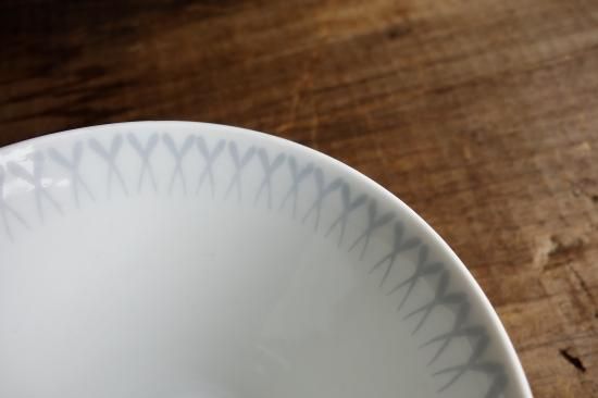 特徴としましては、小振りなカップ&ソーサーで、カップとソーサー共に縁の内側にシザース(ハサミ)なのか、サーベル(刀剣が交わる)が連なり薄灰色で模様が描かれております。