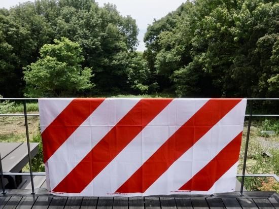 紅白(白地に朱色赤)の太い線(約 紅は20 cm × 白は23 cm)が一定の距離を保って斜めに描かれており、発想はシンプルで、力みなぎるデザインは情熱的です。