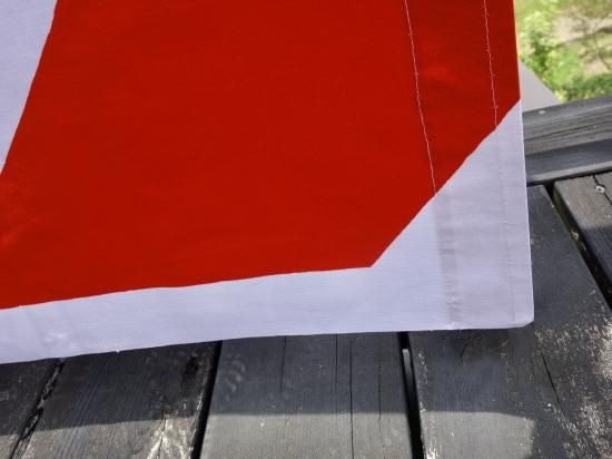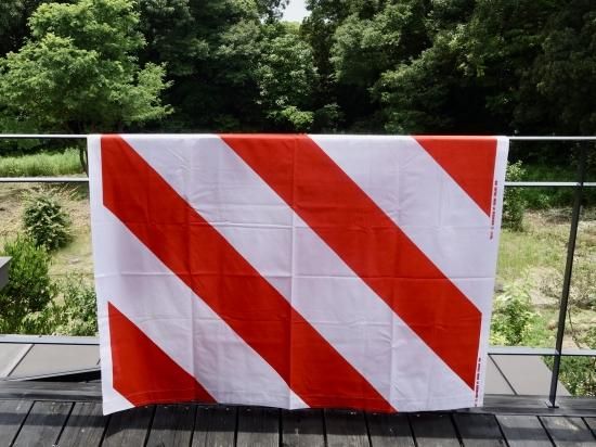 紅白の斜めラインには力強さの様なものが感じられ、どの向きで使っても楽しめそうです。下部の端近くに極小さなピンホールの様な跡が2つ(画像9)見られ、色褪せや汚れなど(画像8,12)薄っすら感じられますが、その他目立つ擦れ、汚れ、色褪せなど見当たらず、比較的綺麗な状態と言えます。