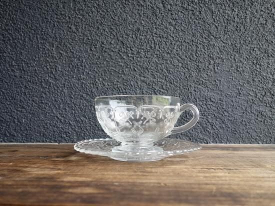 遊園地の乗り物のようなカップは可愛らしい脚付で、三つ葉のクローバー畑(ソーサー)の上に乗り、可愛らしさと抜かりのない細かなデザインに惹きつけられます。ガラスはどことなく厚みがあってしっかりとしており、長く愛用できるお品になってくれることでしょう。