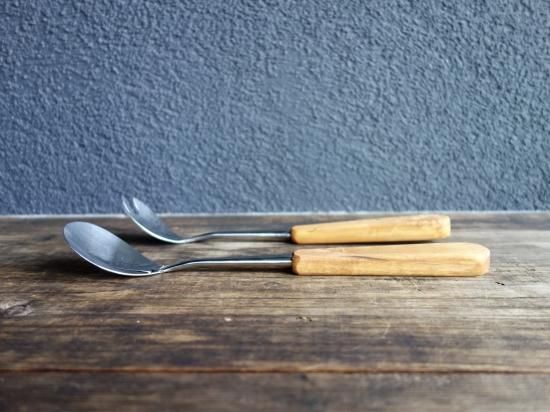 スプーンとフォークの柄はおそらく白樺の木(木のコブの可能性あり)を削って作ったもので、天然オイルを塗布し仕上げてある様に思われます。主にサラダ、その他メイン料理の取り分けなど、普段使いからホームパーティなどで活躍してくれるセットになります。