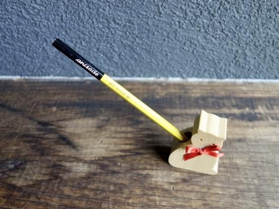 首元に赤リボンの付いたネコが象られた木製のペン立てになります。※佇んでくれているだけでほのぼのしいのですが、何本立てられるか試してはおりませんが楊枝立て(PICK STAND)としても可愛らしいと思います。
