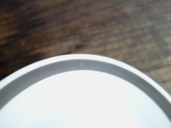 縁寄りにワンポイントで茶灰色のラインが描かれています。表層の細かな擦れやカトラリー跡、色褪せ(画像13)など多少見られる部分はあるのですが、目立つ擦れ、キズ、汚れなど見当たらず比較的綺麗な状態です。