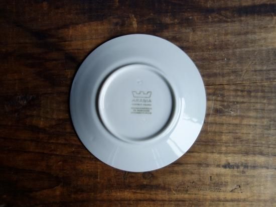 ゆらぎ、釉薬ムラ、座のくすみは少し見られはするものの、概ね綺麗な状態です。焼成時の支柱跡がいくつか見られる状態です。ARABIA 旧ロゴのバックスタンプが記されております。