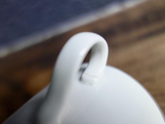 持ち手の内側上部に貫入と茶色の汚れが重なった様な跡(画像10)が1箇所見られる程度で概ね綺麗です。※こちらは持ち手が丸型です。
