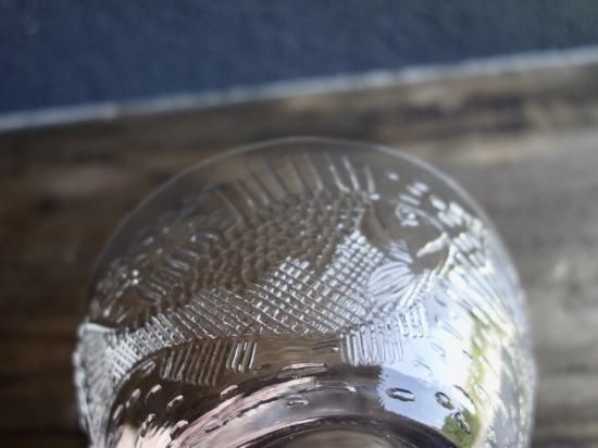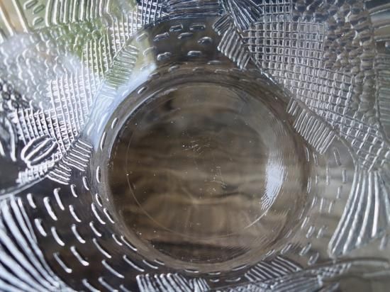 経年による風合いの変化は多少なり出ているのかもしれませんが艶やかで、表層の細かな擦れや微細キズなど少し感じる箇所がある程度で、目立つ擦れ、キズ、汚れなど見当たらず、欠けや割れなど見られないことから、時を刻んで来たガラスの器として概ね良好な状態と言えます。※ガラス製品特有のゆらぎ、シワやスジなどのガラス肌、加工時の小さな気泡や小キズ、プレスガラス製法の絵柄などの個体差は出ている可能性はございます。