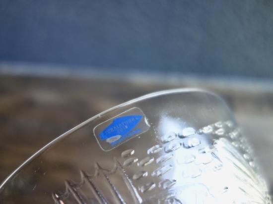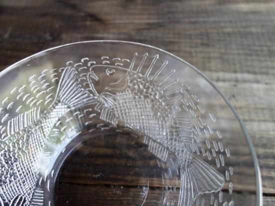 可愛らしい表情をした三匹の魚が気持ち良さそうに泳いでいる姿が、ボウルの外側面からプレスされ象られています。その為内面はツルッと滑らかです。表層の細かな擦れや縁近くの細キズ(画像3)など少し感じる箇所はあるものの、目立つ擦れ、キズ、汚れなど見当たらず概ね綺麗な状態と言えます。側面上部に Nuutajarvi ロゴシール(画像4)が残されています。
