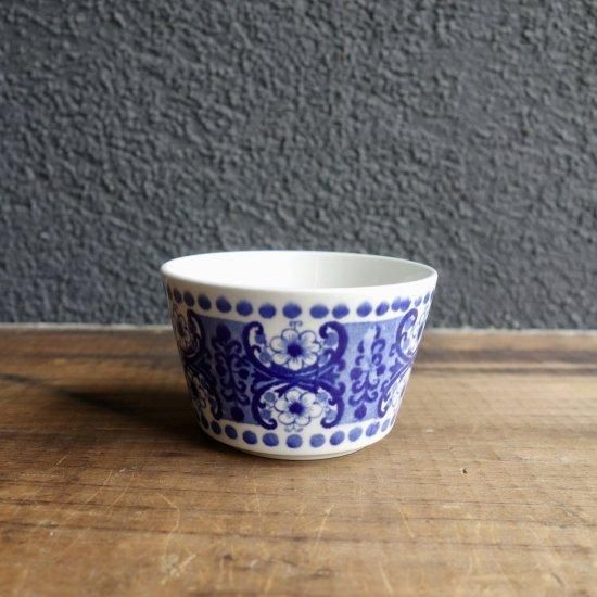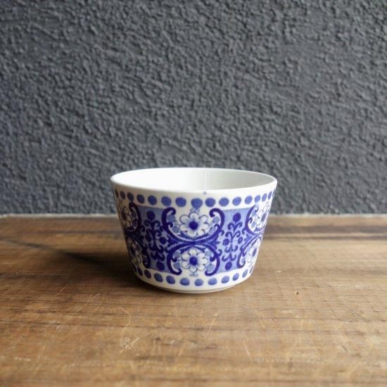 "ALI" は フォルムデザイン KAJ FRANCK(カイ・フランク)、デコレーションデザイン Raija Uosikkinen(ライヤ・ウオシッキネン)によって手掛けられた、異国情緒漂う花やツルのデザインが特徴で魅力的なシリーズです。ブルーとブラウンの色味展開で、色によって製造時期が異なると言う特徴も持ち合わせており、こちらのブルーが先駆けで1961 - 73年、少し遅れてブラウンは1963 - 1969年とされています。デコレーションはプリントによるものですが、色の濃淡、ドットなどの大きさや間隔の個体差が現れる、古き良き時代なる手づくりの趣を感じさせてくれる製法です。