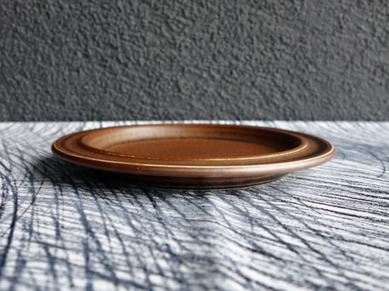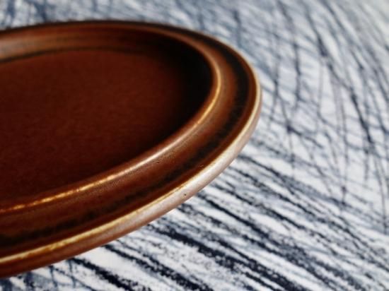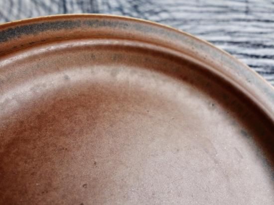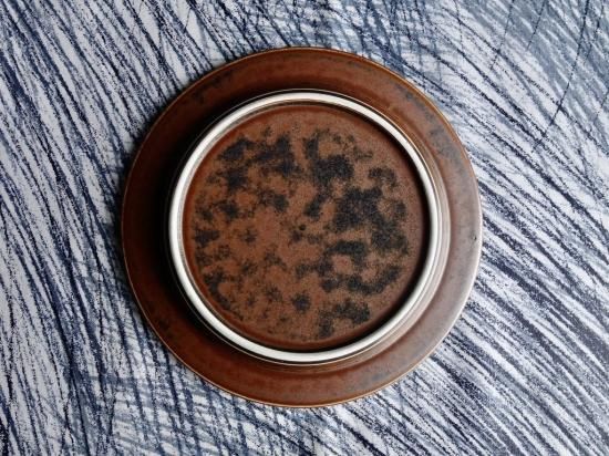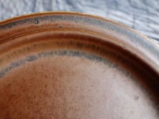 独特の釉薬によって全く同じ模様はないとされており、その意味合いから Ruska(紅葉)という名前が生まれたのではと想像が膨らみます。なぜなら紅葉も様々な環境条件などによって表情が異なるものだからです。その名の通り、こちらの作品も独特な表情を持っており、赤さび色メインで一部に黒が表れている雰囲気です。カトラリー跡と言える細かな擦れや微細キズ、色褪せなど(画像4,5)の使用感はRuskaの表情に紛れ目立つ感じの跡ではなく概ね綺麗な状態と言えます。ペン先ほどの小さなクレーターの様な凹みが少々見られますが焼成時の跡になります。