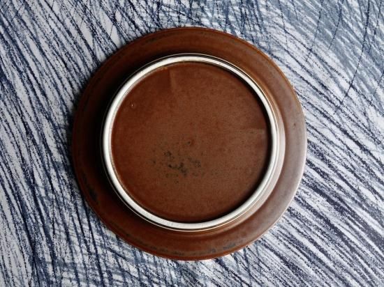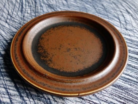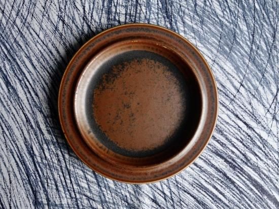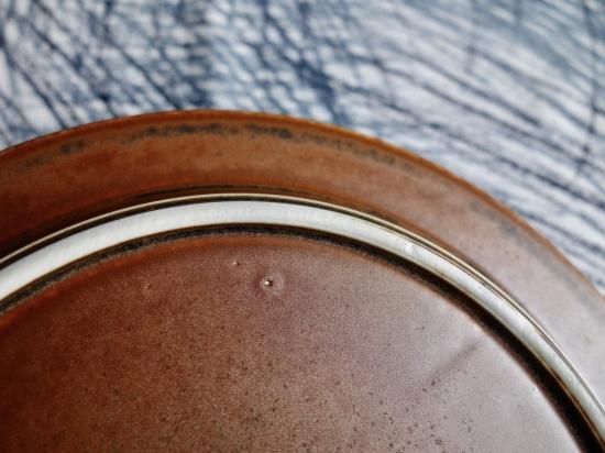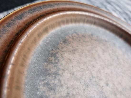 独特の釉薬によって全く同じ模様はないとされており、その意味合いから Ruska(紅葉)という名前が生まれたのではと想像が膨らみます。なぜなら紅葉も様々な環境条件などによって表情が異なるものだからです。その名の通り、こちらの作品も独特な表情を持っており、赤さび色メインで一部に黒が表れている雰囲気です。カトラリー跡と言える細かな擦れや微細キズ、色褪せなど(画像4)の使用感はRuskaの表情に紛れ目立つ感じの跡ではなく概ね綺麗な状態と言えます。内縁の一部などにペン先ほどの細かな凸跡(画像3)や小さなクレーターの様な凹みが少々見られますが焼成時の跡になります。
