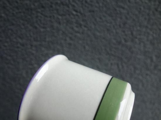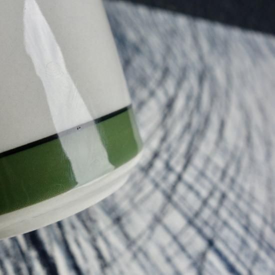 アーミーグリーンと黒の細ライン、縁に紫ラインを加える感覚に嫉妬してしまいます。細かな擦れや微キズ(画像5)などの使用感は少しありますが、目立つ擦れ、キズ、汚れ、色褪せなど見当たらず概ね綺麗な状態と言えます。※ペン先程の小さな凹跡は焼成時の跡になります。