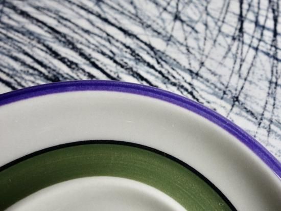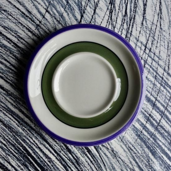 中央からアーミー グリーン、黒、紫の順番でラインデザインが描かれております。見られがちなカトラリー跡と言える細かな擦れや小キズなど(画像10)目立たない箇所に僅かに感じる程度で、目立つ擦れ、キズ、汚れ、色褪せなど見当たらず概ね良好な状態と言えます。