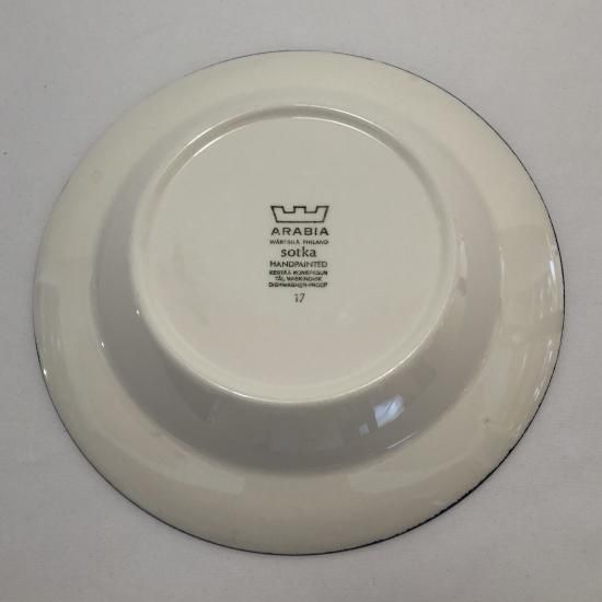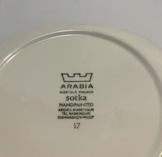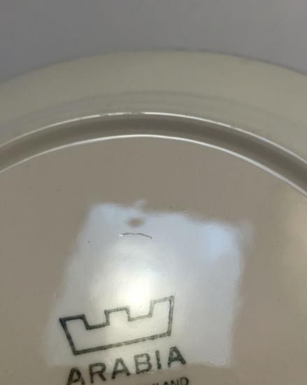 細かな擦れ、小キズや細キズ(画像10)、座のくすみなど多少見られはするものの、比較的綺麗な状態と言えます。ARABIAの旧ロゴバックスタンプが記されています。※焼成時の支柱跡はいくつか見られる状態です。