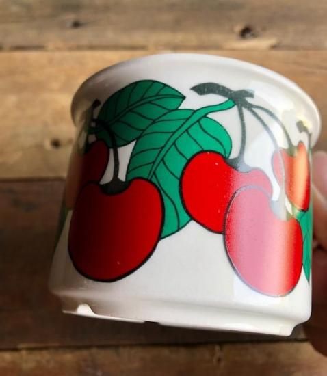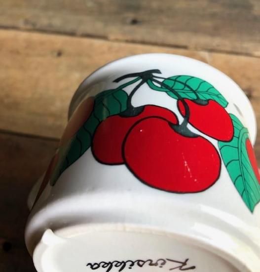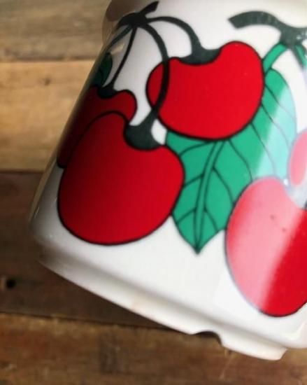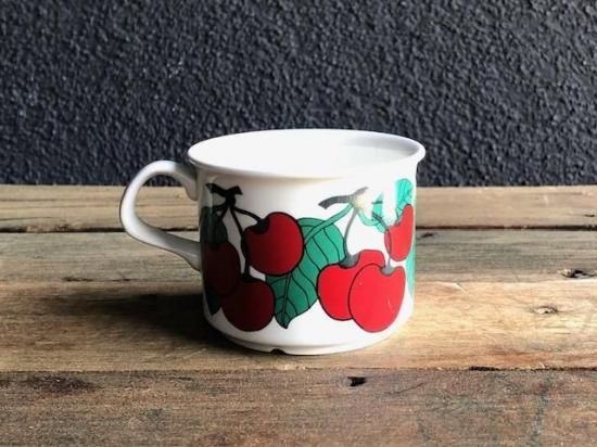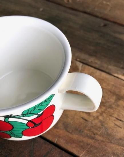 "kirsikka" は1970年代の中頃に製造されたシリーズ作品で、デコレーションデザインは Inkeri Seppala Leivo(インケリ・セッパラ・レイヴォ)によって手掛けられた器になります。「サクランボ」という意味で、その名の通り、鈴なりに実ったサクランボがカップ全体に大胆且つ色鮮やかに描かれた大変美しい作品と言えます。
