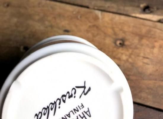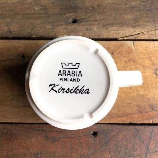 高台内の微細キズ、良く見ると座上表面に微細スジの様な跡など多少見られますが、いずれも目立つ感じの跡ではなく比較的綺麗な状態と言えます。ARABIA 旧ロゴ、kirsikkaのバックスタンプが残されています。