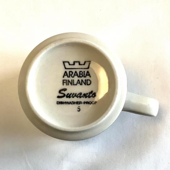 高台内に細かな擦れなどの使用感が見られ比較的綺麗な状態と言えます。ARABIA FINLAND Suvanto などのバックスタンプが記され、食洗機可とされています。